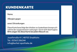 Ersparen Sie sich das Sammeln von Einzelbelegen. Mit der Kundenkarte und der Speicherung aller Angaben drucken wir Ihnen jederzeit oder am Jahresende eine Kostenaufstellung zur Vorlage bei Ihrer Krankenkasse oder beim Finanzamt. Wenn Sie als Privatpatient am Jahresende vor der Entscheidung stehen, ob Sie Ihre Ausgaben für Arzneimittel selbst tragen oder bei der privaten Krankenversicherung einreichen sollen, drucken wir Ihnen als Karteninhaber eine komplette Übersicht.